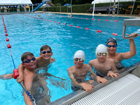 Am Nachmittag gab es als Zugabe noch die 100 m Rücken: Die Aufgabe bestand hier vor allem darin, die drei Wenden sauber und regelgerecht auszuführen. Dies gelang allen und somit fielen die Bestmarken. Nach einem Missgeschick am Vormittag schwamm Matz Sperling mit Wut im Bauch zu einer tollen Verbesserung von über fünf Sekunden, auch dank sehr schneller Wenden. Das Highlight setzte Janne Neuparth mit tollen 1:34,8 min dank sehr guter Technik. Weitere Bestmarken erzielten Gabriel, Lena, Klara und vor allem Lia: Sie schwamm ein beherztes Rennen und schlug dank guter Beinarbeit und effektiver Armarbeit nach sehr erfreulichen 1:37,7 min an.