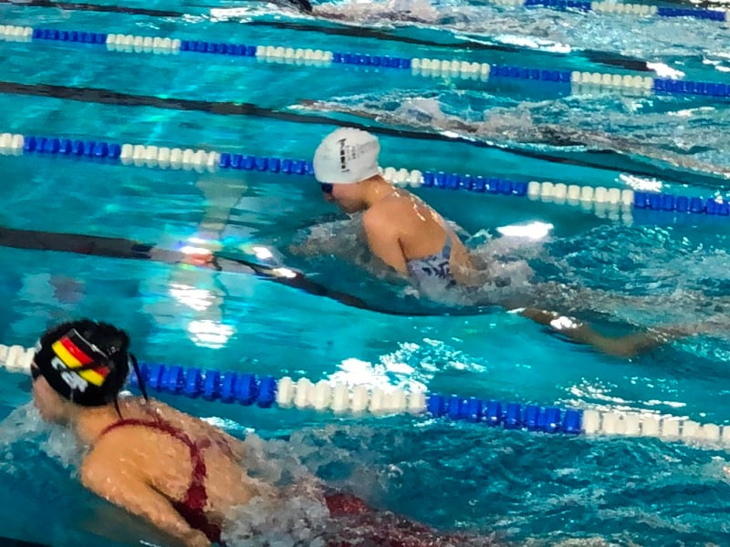 Immer noch fasziniert von der Atmosphäre ging’s weiter zum Rennen über 50 m Rückenbeinarbeit. Hier zeigte Sie eine starke Tauchphase am Start und schlug in guten 0:54,9 min an. Das war aber nur der Auftakt, kurz darauf durfte sie über ihre Lieblingsstrecke 100 m Rücken ran: Dank couragiertem Beginn, toller Wende und gutem Finish verbesserte sie sich um über drei Sekunden und finishte in 1:25,0 min.