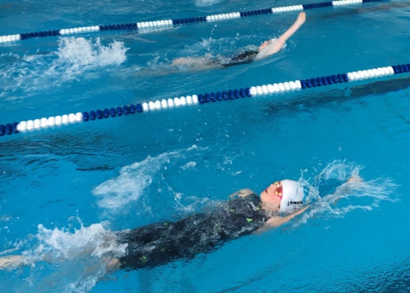 Nachdem alle die Kraulstrecke technisch gut bewältig hatten, ging’s auf die Rückenstrecke. Hier gab es nicht so viele Probleme mit der Atmung, dafür war die Orientierung komplizierter. Wichtig war in jedem Fall wieder der stabile Beinschlag als Motor. Den Beginn machte wieder Tira Knöner, sie gewann auch hier deutlich und freute sich, dass sie gleich beim ersten Wettkampf einen Doppelsieg feiern konnte. Ebenfalls auf's Podium konnten Kira Sohrmann und Nicole Kirsch dank guter Technik und Ausdauer schwimmen. Das beste Ergebnis zeigte aber wieder Lena Krug, die mit 0:23,9 min auch die Rückenstrecke souverän gewann, vor allem, weil sie gut an den Beinschlag gedacht hatte. Gute Ansätze zeigten auch die Geschwister Alexandra und Nina Savitschev; beide schwammen fehlerfrei - und das trotz hoher Nervosität. Alexandra erkämpfte sogar gleich einen Podestplatz. Ebenso konnte Chelsea Nwosu mit starkem Beinschlag überzeugen. Auch die Jungs hatten viel zu bieten: Liam Neumann siegte auch im Rückenschwimmen und überzeugte vor allem durch tolle Wasserlage. Jonah Schupp lernte schnell und schwamm diesmal voll durch, dadurch gewann er die erhoffte Medaille. Der dritte Medaillengewinner war wiederum David Munteanu, der kraftvoll durchzog und Bronze gewann.