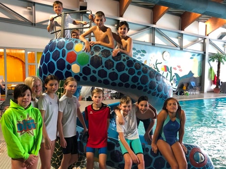 Mit der heutigen Siegerehrung ging das erste Trimester der neuen Gruppe im Aquawede zu Ende. Alle hatten viel Spaß im Funtasia. Viele Attraktionen sorgten für Kurzweil, unter anderem eine Riesenkrake, die die Kinder scheinbar verschluckte, sie aber über Rutsche an der Rückseite wieder auswarf. Aber auch Rutschen, Trampoline, Fahrgeschäfte und eine Hüpfburg forderten die Kinder fast wie beim Landtraining. Am Ende konnten alle eine Urkunde mitnehmen, diese bescheinigte die meist guten Leistungen beim ersten Trimester-Test in der vergangenen Woche. Bei diesem Test ging es darum herauszufinden, wer die schwimmtechnischen Übungen am besten beherrscht, nur am Rande spielte die Geschwindigkeit eine Rolle. Inhalte waren Rücken- und Kraulschwimmen, Gleiten, Rollen und Beinarbeit. Letztendlich setzte sich das Trio Lena Krug, Kira Sohrmann und Nicole Kirsch knappt vor den besten Jungs durch und wurde mit einem Pokal belohnt. Ab der nächsten Woche startet das zweite Trimester und gleichzeitig endet die Probetrainingsphase.